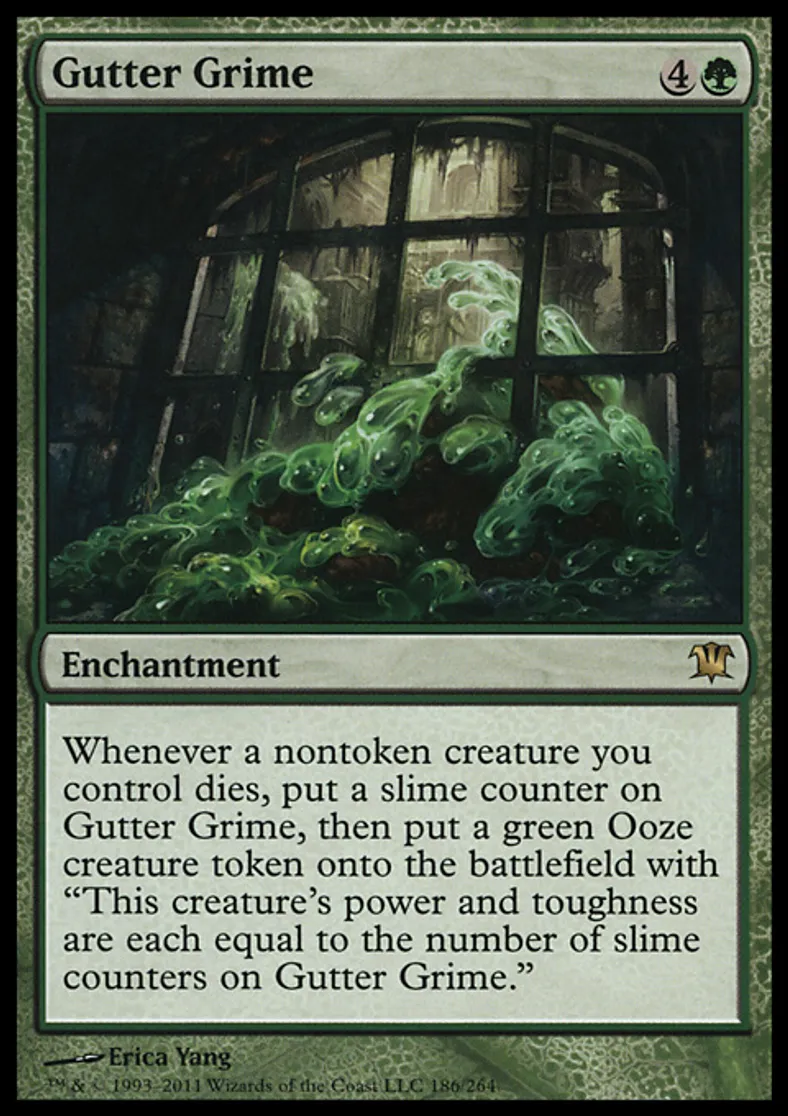 | Oracle Text | Whenever a nontoken creature you control dies, put a slime counter on Gutter Grime, then put a green Ooze creature token onto the battlefield with "This creature's power and toughness are each equal to the number of slime counters on Gutter Grime." | ||