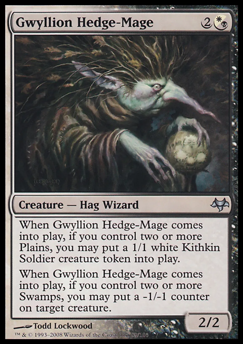 | Oracle Text | When Gwyllion Hedge-Mage enters the battlefield, if you control two or more Plains, you may put a 1/1 white Kithkin Soldier creature token onto the battlefield. When Gwyllion Hedge-Mage enters the battlefield, if you control two or more Swamps, you may put a -1/-1 counter on target creature. | ||