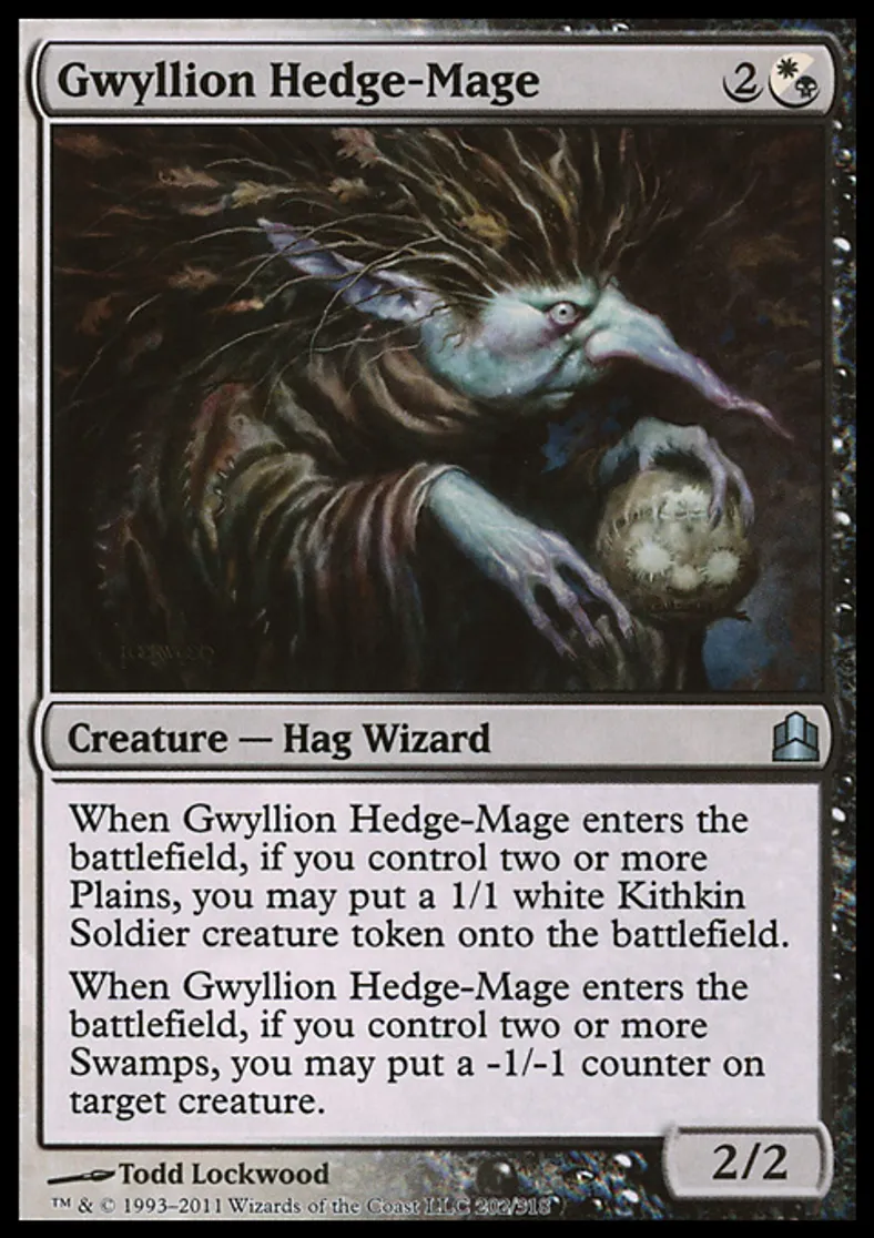 | Oracle Text | When Gwyllion Hedge-Mage enters the battlefield, if you control two or more Plains, you may put a 1/1 white Kithkin Soldier creature token onto the battlefield. When Gwyllion Hedge-Mage enters the battlefield, if you control two or more Swamps, you may put a -1/-1 counter on target creature. | ||