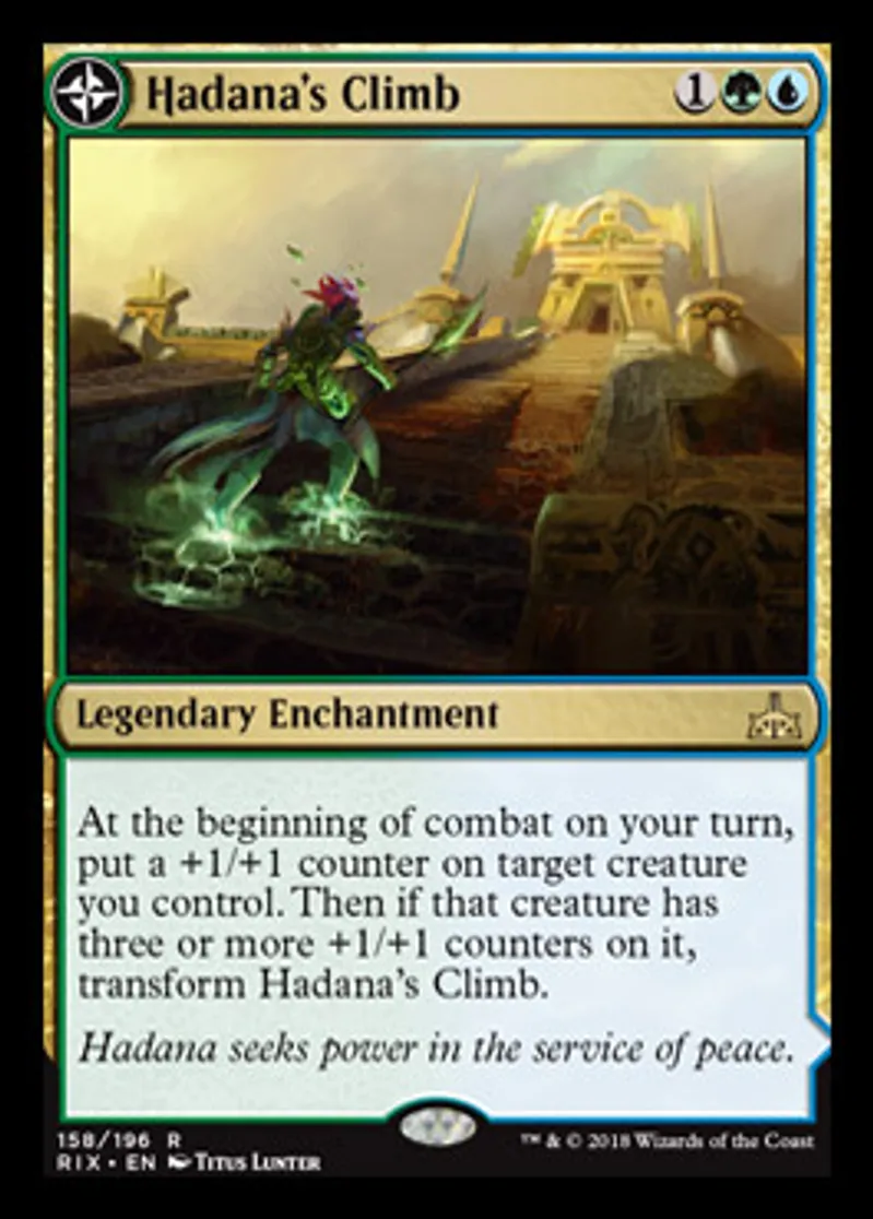 | Oracle Text | At the beginning of combat on your turn, put a +1/+1 counter on target creature you control. Then if that creature has three or more +1/+1 counters on it, transform Hadana's Climb. | ||