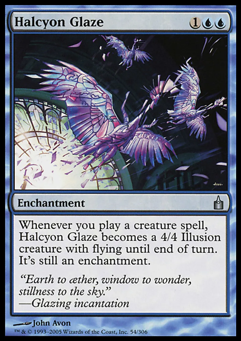 | Oracle Text | Whenever you cast a creature spell, Halcyon Glaze becomes a 4/4 Illusion creature with flying until end of turn. It's still an enchantment. | ||