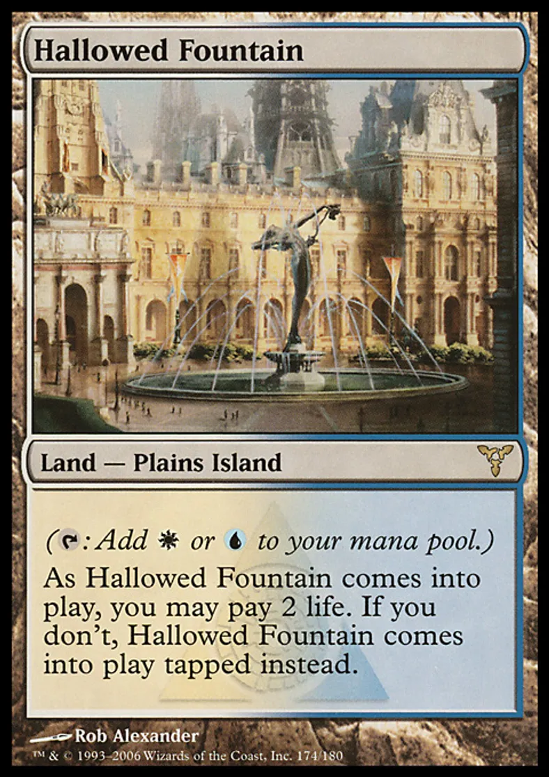 | Oracle Text | ({{t}}: Add {{w}} or {{u}} to your mana pool.) As Hallowed Fountain enters the battlefield, you may pay 2 life. If you don't, Hallowed Fountain enters the battlefield tapped. | ||