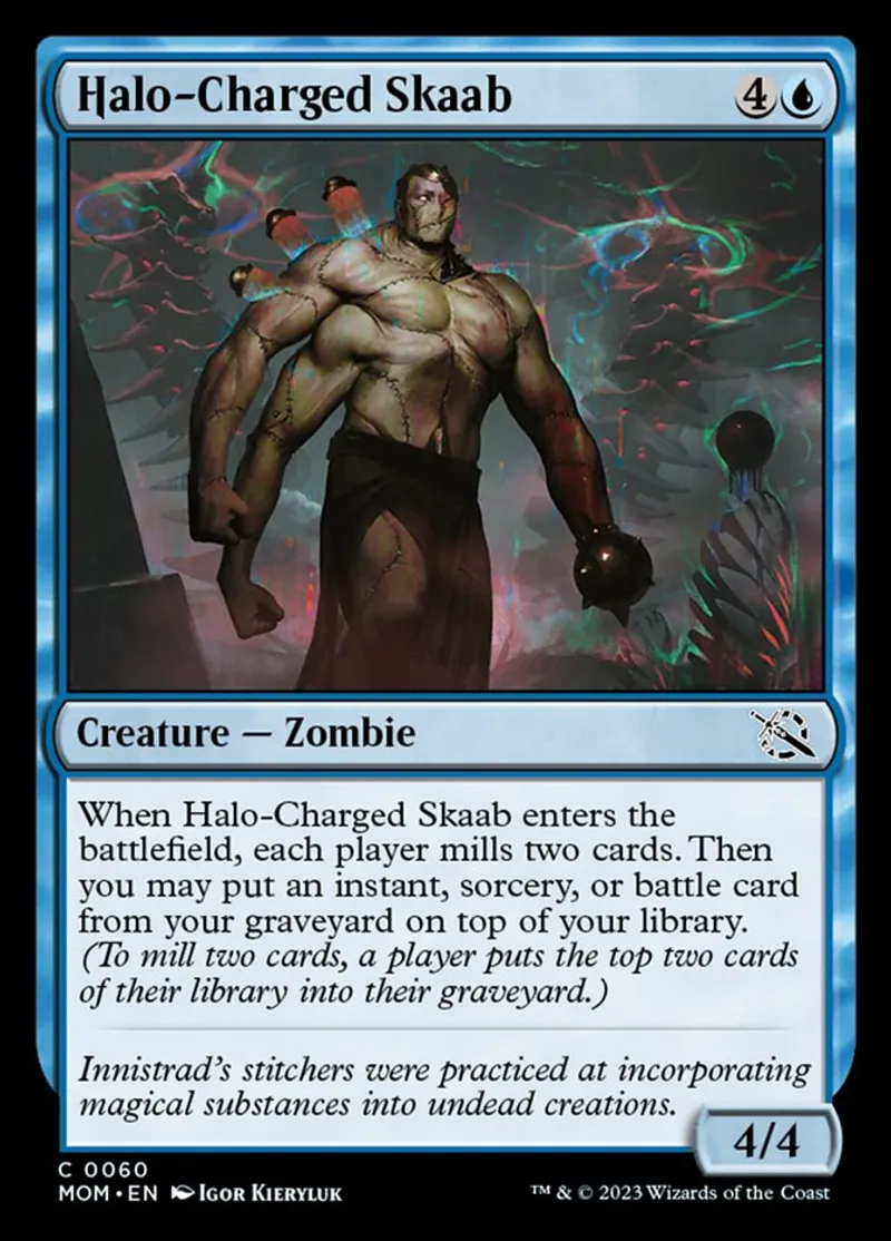 | Oracle Text | When Halo-Charged Skaab enters the battlefield, each player mills two cards. Then you may put an instant, sorcery, or battle card from your graveyard on top of your library. (To mill two cards, a player puts the top two cards of their library into their graveyard.) | ||