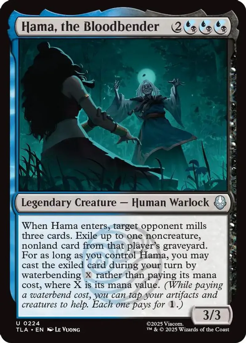 | Oracle Text | when hama enters, target opponent mills three cards. exile up to one noncreature, nonland card from that player's graveyard. for as long as you control hama, you may cast the exiled card during your turn by waterbending x rather than paying its mana cost, where x is its mana value. (while paying a waterbend cost, you can tap your artifacts and creatures to help. each one pays for 1.) | ||