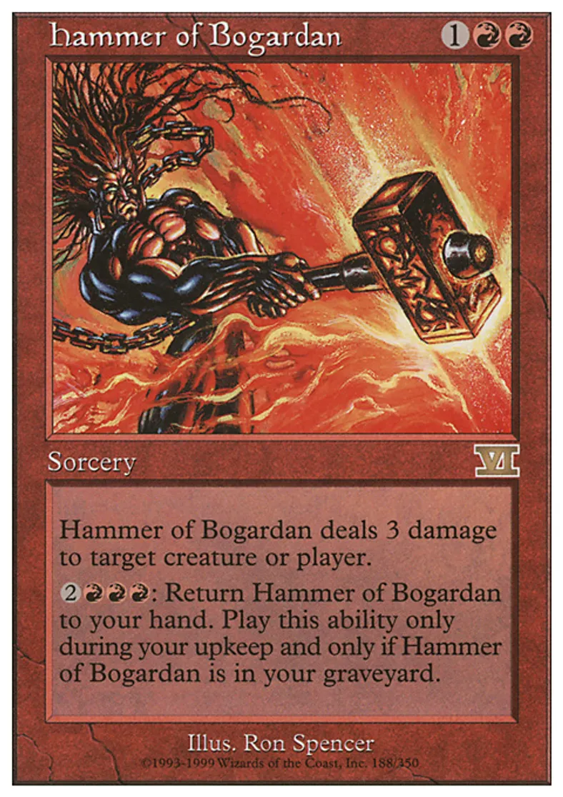 | Oracle Text | Hammer of Bogardan deals 3 damage to target creature or player. {{2}}{{r}}{{r}}{{r}}: Return Hammer of Bogardan from your graveyard to your hand. Activate this ability only during your upkeep. | ||