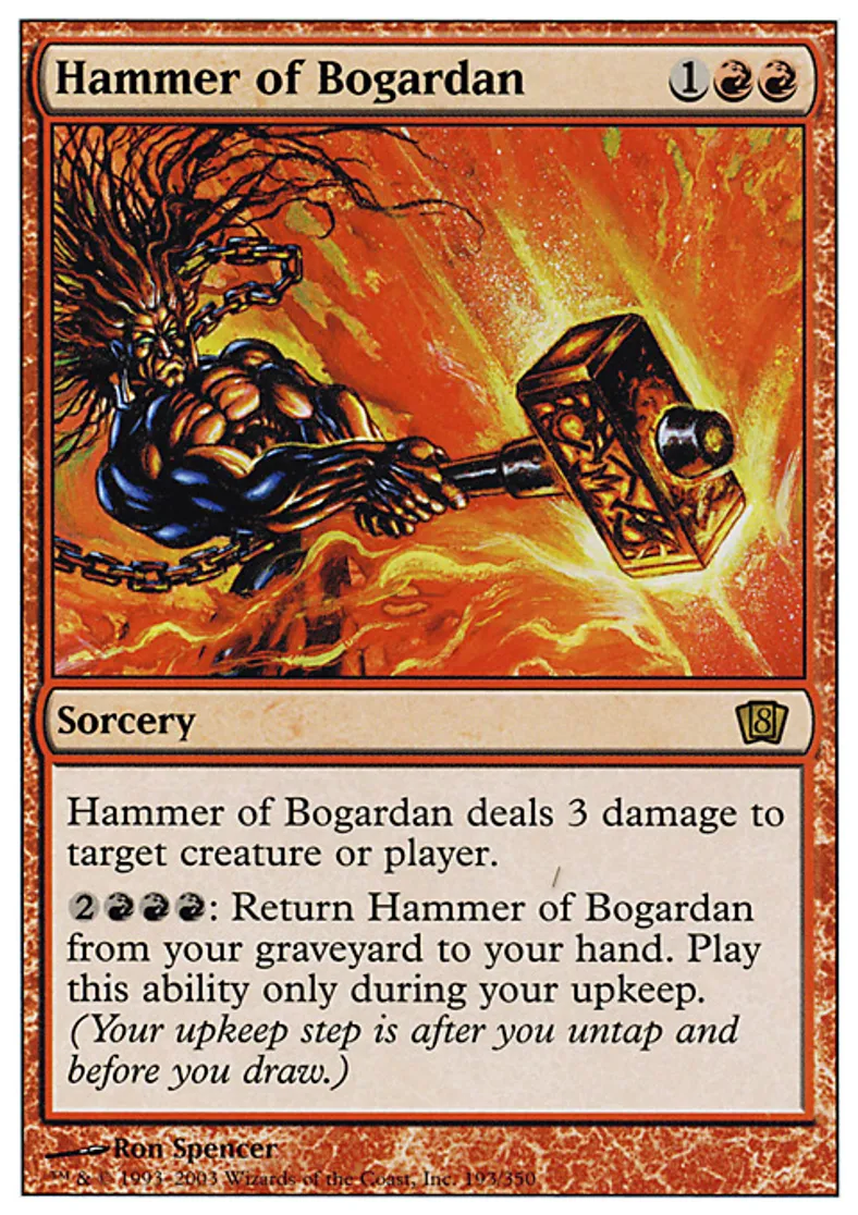 | Oracle Text | Hammer of Bogardan deals 3 damage to target creature or player. {{2}}{{r}}{{r}}{{r}}: Return Hammer of Bogardan from your graveyard to your hand. Activate this ability only during your upkeep. | ||