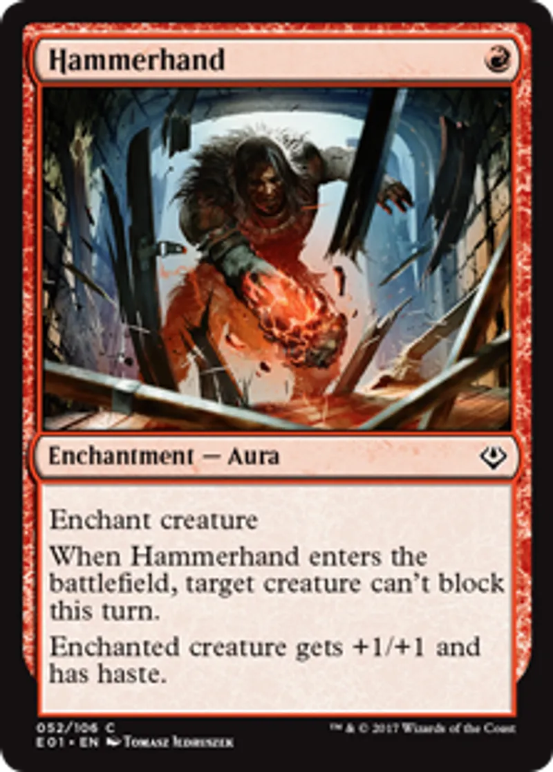 | Oracle Text | Enchant creature When Hammerhand enters the battlefield, target creature can't block this turn. Enchanted creature gets +1/+1 and has haste. (It can attack and {{t}} no matter when it came under your control.) | ||