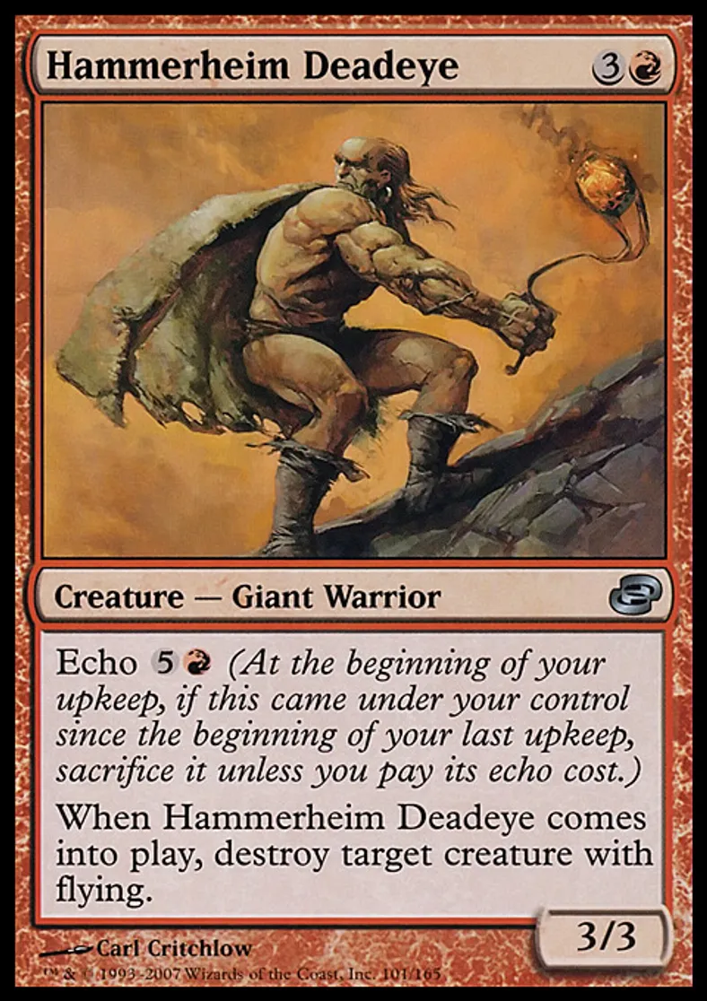 | Oracle Text | Echo {{5}}{{r}} (At the beginning of your upkeep, if this came under your control since the beginning of your last upkeep, sacrifice it unless you pay its echo cost.) When Hammerheim Deadeye enters the battlefield, destroy target creature with flying. | ||