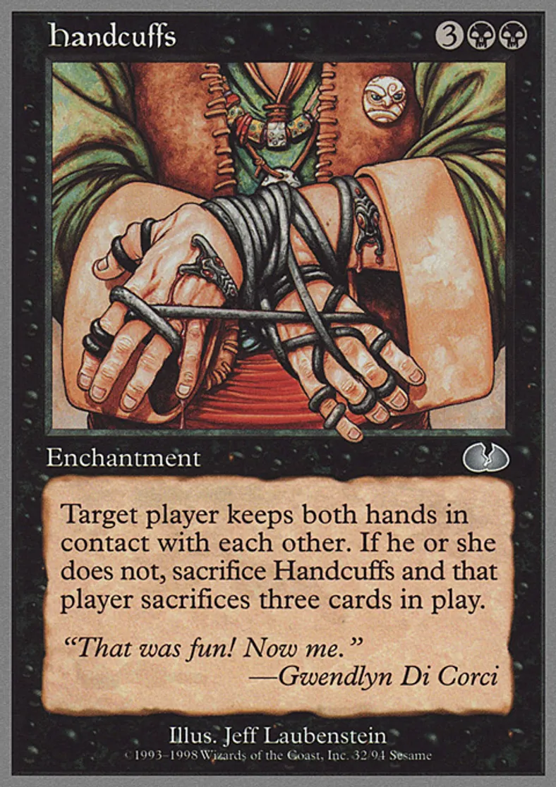 | Oracle Text | Target player keeps both hands in contact with each other. If he or she does not, sacrifice Handcuffs and that player sacrifices three cards in play. | ||