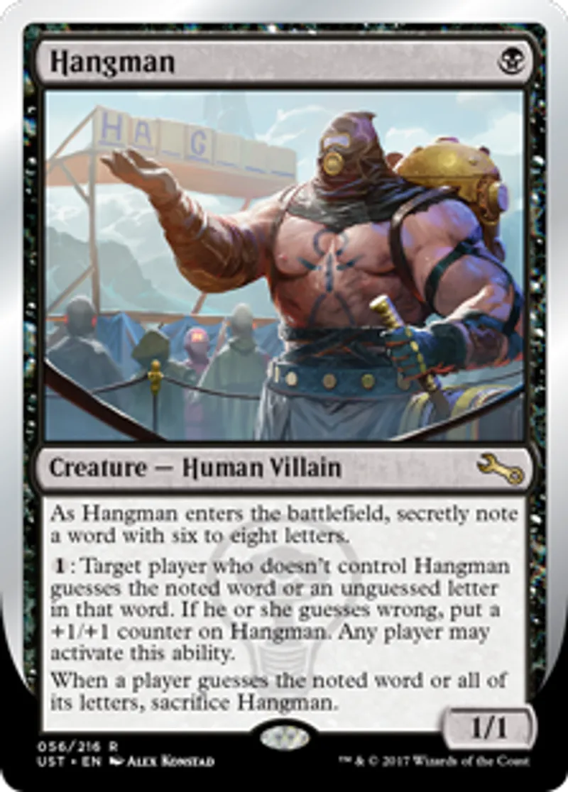 | Oracle Text | As Hangman enters the battlefield, secretly note a word with six to eight letters. {{1}}: Target player who doesn't control Hangman guesses the noted word or an unguessed letter in that word. If he or she guesses wrong, put a +1/+1 counter on Hangman. Any player may activate this ability. When a player guesses the noted word or all of its letters, sacrifice Hangman. | ||