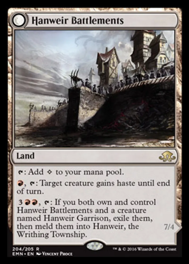 {{3}}{{r}}{{r}}, {{t}}: If you both own and control Hanweir Battlements and a creature named Hanweir Garrison, exile them, then meld them into Hanweir, the Writhing Township | ||