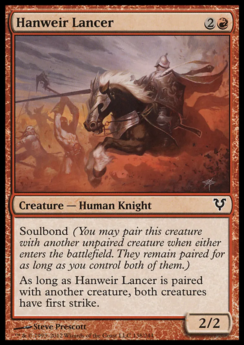 | Oracle Text | Soulbond (You may pair this creature with another unpaired creature when either enters the battlefield. They remain paired for as long as you control both of them.) As long as Hanweir Lancer is paired with another creature, both creatures have first strike. | ||
