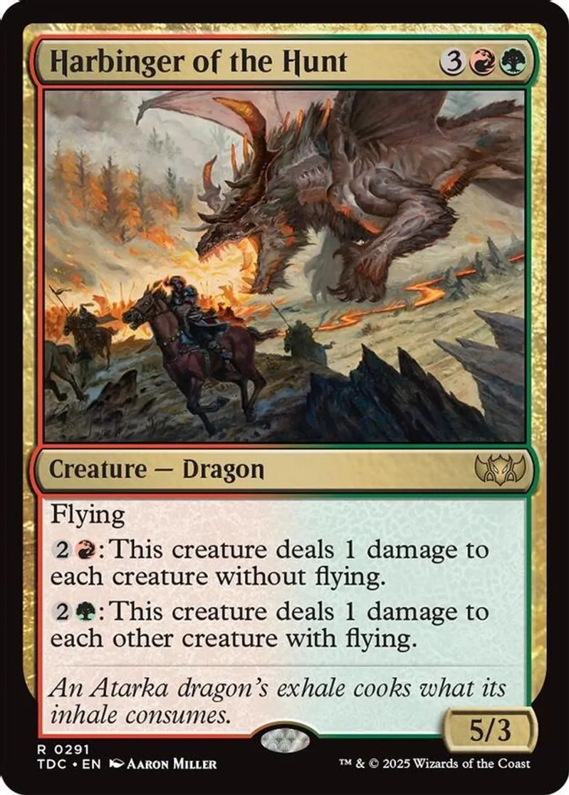 Magic: the Gathering (mtg) Rare legendary creature — elder dragon Harbinger of the Hunt from Commander: Tarkir: Dragonstorm (TDC) last updated 2026-02-21 15:07:32