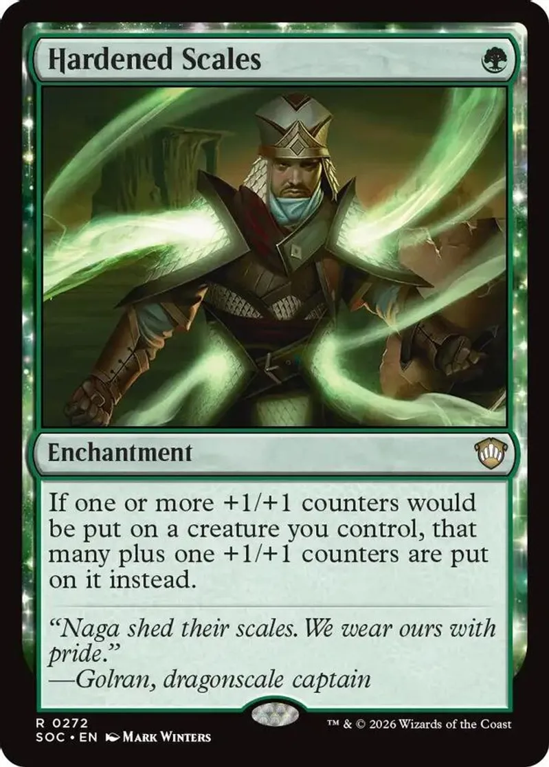 Magic: the Gathering (mtg) Rare enchantment Hardened Scales from Commander: Secrets of Strixhaven (SOC) last updated 2026-04-17 00:25:05