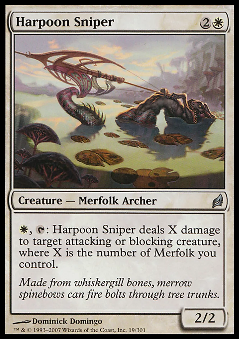 | Oracle Text | {{w}}, {{t}}: Harpoon Sniper deals X damage to target attacking or blocking creature, where X is the number of Merfolk you control. | ||