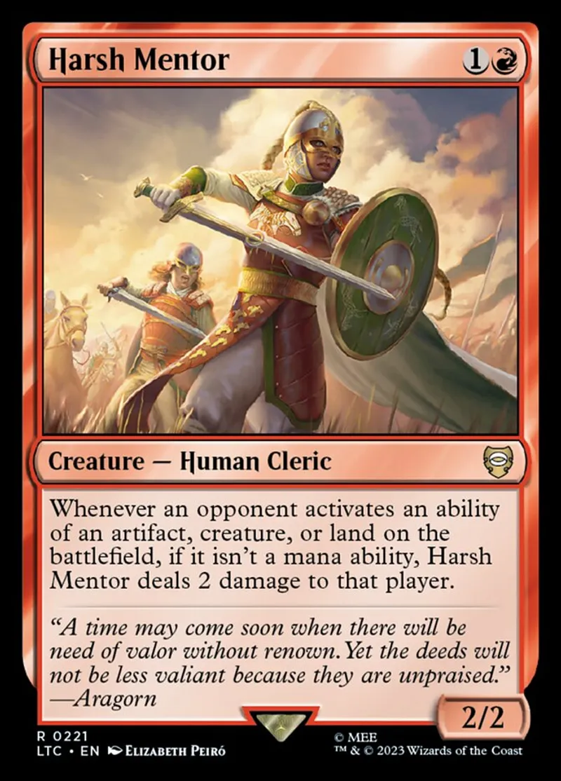 | Oracle Text | Whenever an opponent activates an ability of an artifact, creature, or land on the battlefield, if it isn't a mana ability, Harsh Mentor deals 2 damage to that player. | ||