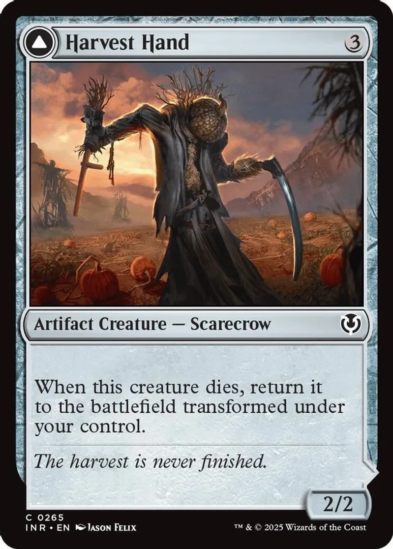 Magic: the Gathering (mtg) Common artifact creature — scarecrow // artifact — equipment Harvest Hand from Innistrad Remastered (INR) last updated 2026-02-21 15:35:36