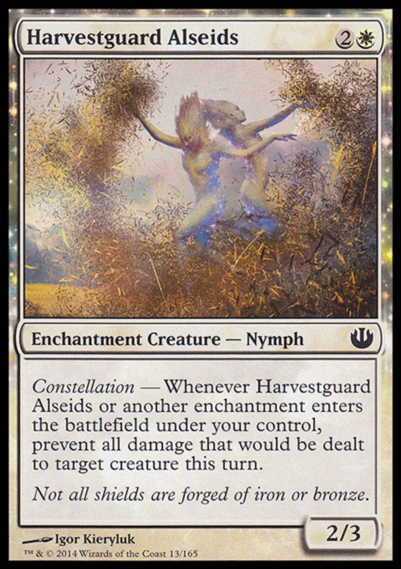 | Oracle Text | Constellation — Whenever Harvestguard Alseids or another enchantment enters the battlefield under your control, prevent all damage that would be dealt to target creature this turn. | ||