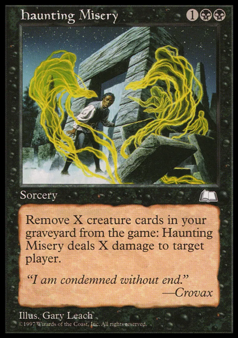 | Oracle Text | As an additional cost to cast Haunting Misery, exile X creature cards from your graveyard. Haunting Misery deals X damage to target player. | ||