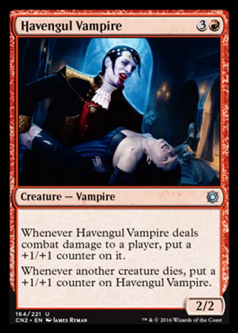 | Oracle Text | Whenever Havengul Vampire deals combat damage to a player, put a +1/+1 counter on it. Whenever another creature dies, put a +1/+1 counter on Havengul Vampire. | ||