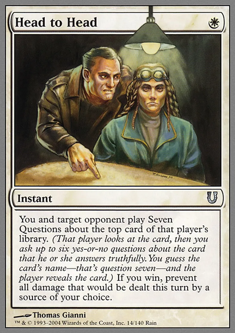 | Oracle Text | You and target opponent play Seven Questions about the top card of that player's library. (That player looks at the card, then you ask up to six yes-or-no questions about the card that he or she answers truthfully. You guess the card's name—that's question seven—and the player reveals the card.) If you win, prevent all damage that would be dealt this turn by a source of your choice. | ||