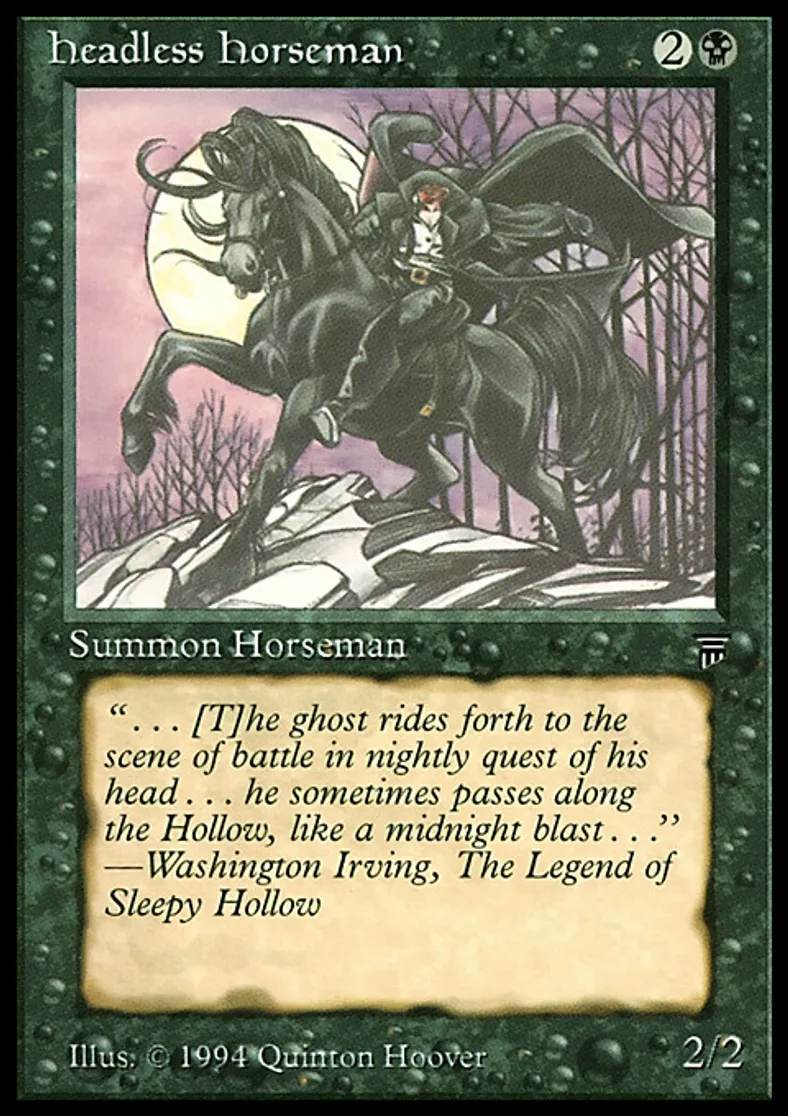 | Flavor Text | ". . . The ghost rides forth to the scene of battle in nightly quest of his head . . . he sometimes passes along the Hollow, like a midnight blast . . ."Washington Irving, The Legend of Sleepy Hollow | ||