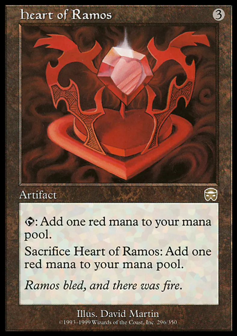 | Oracle Text | {{t}}: Add {{r}} to your mana pool. Sacrifice Heart of Ramos: Add {{r}} to your mana pool. | ||