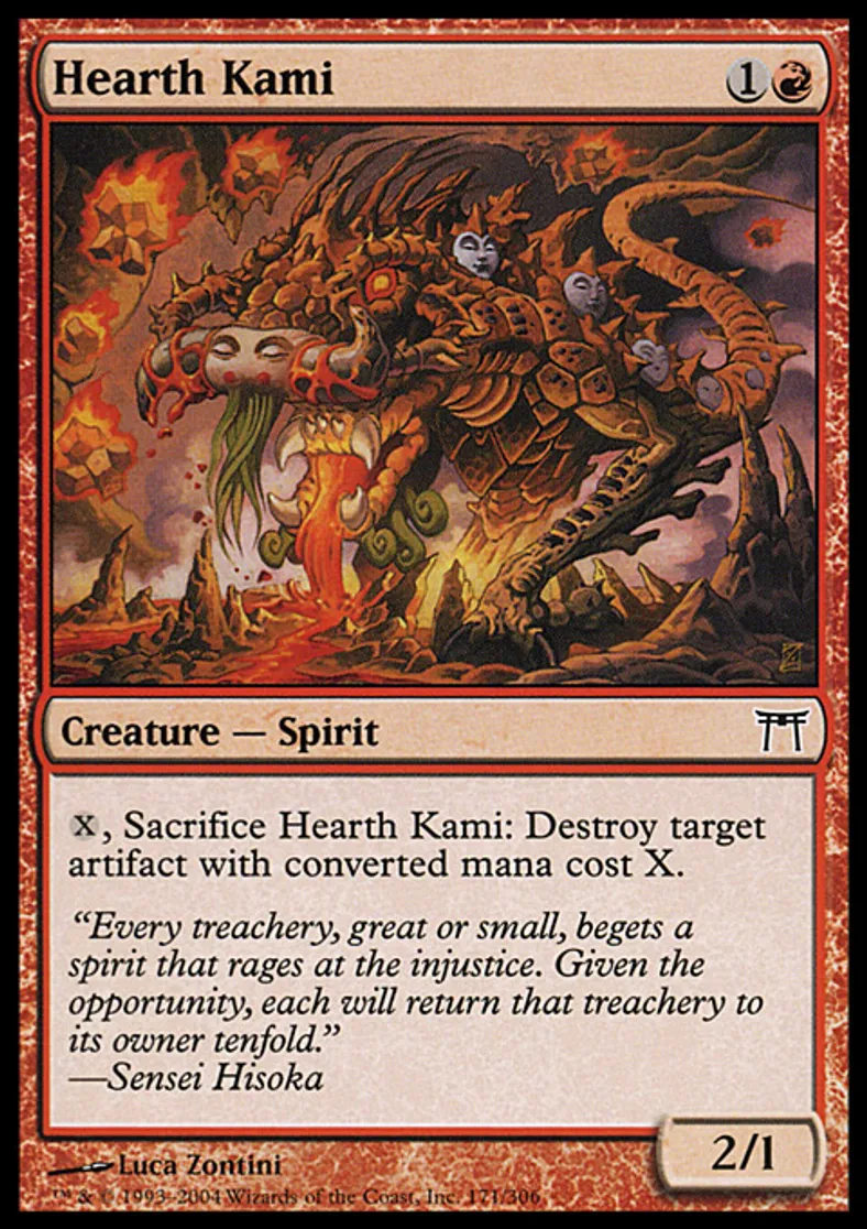 | Oracle Text | {{x}}, Sacrifice Hearth Kami: Destroy target artifact with converted mana cost X. | ||