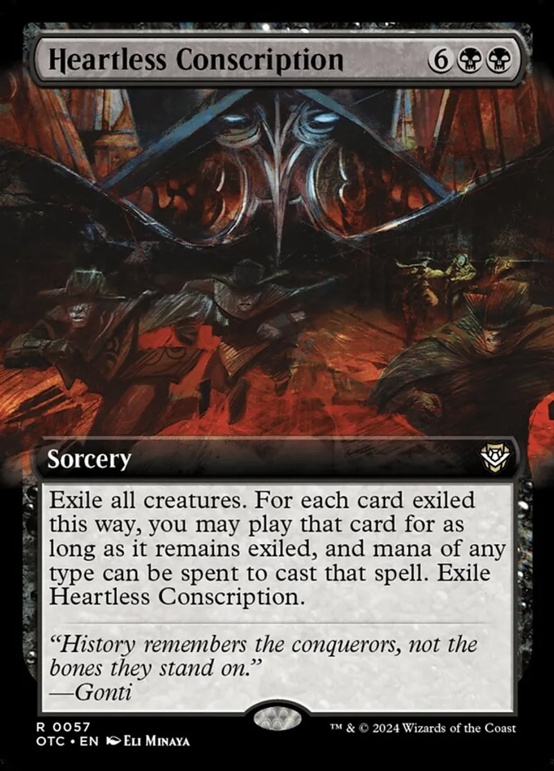 Heartless Conscription (Extended Art) is a rare in the set Outlaws of Thunder Junction Commander.