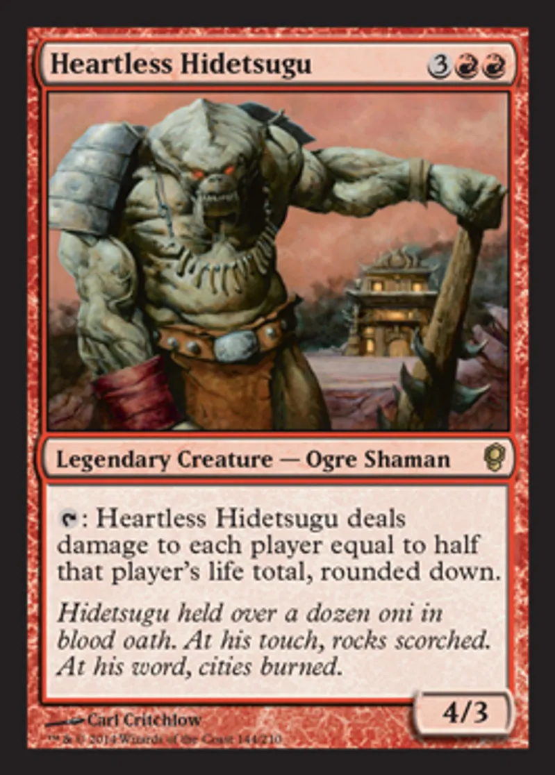 | Oracle Text | {{t}}: Heartless Hidetsugu deals damage to each player equal to half that player's life total, rounded down. | ||