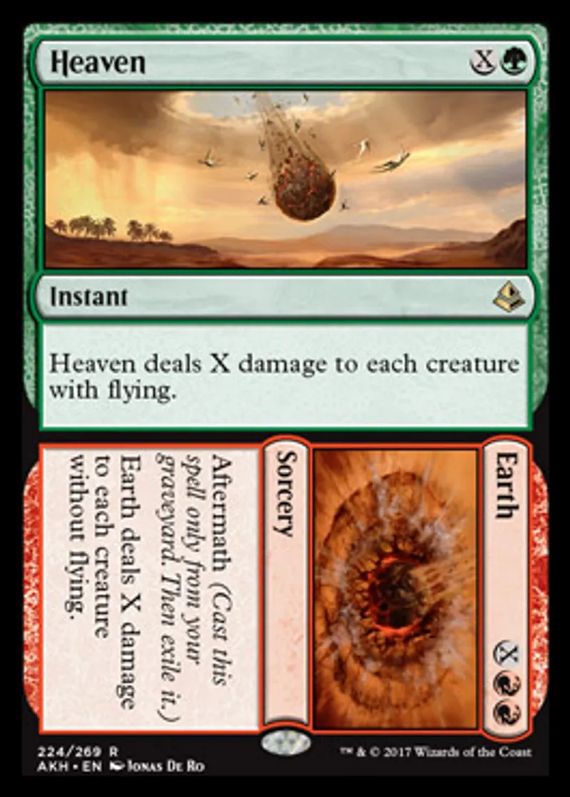 | Oracle Text | Heaven Heaven deals X damage to each creature with flying. Earth {{X}}{{R}}{{R}} — Sorcery Aftermath (Cast this spell only from your graveyard. Then exile it.) Earth deals X damage to each creature without flying. | ||