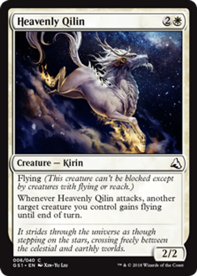 | Oracle Text | Flying (This creature can't be blocked except by creatures with flying or reach.) Whenever Heavenly Qilin attacks, another target creature you control gains flying until end of turn. | ||