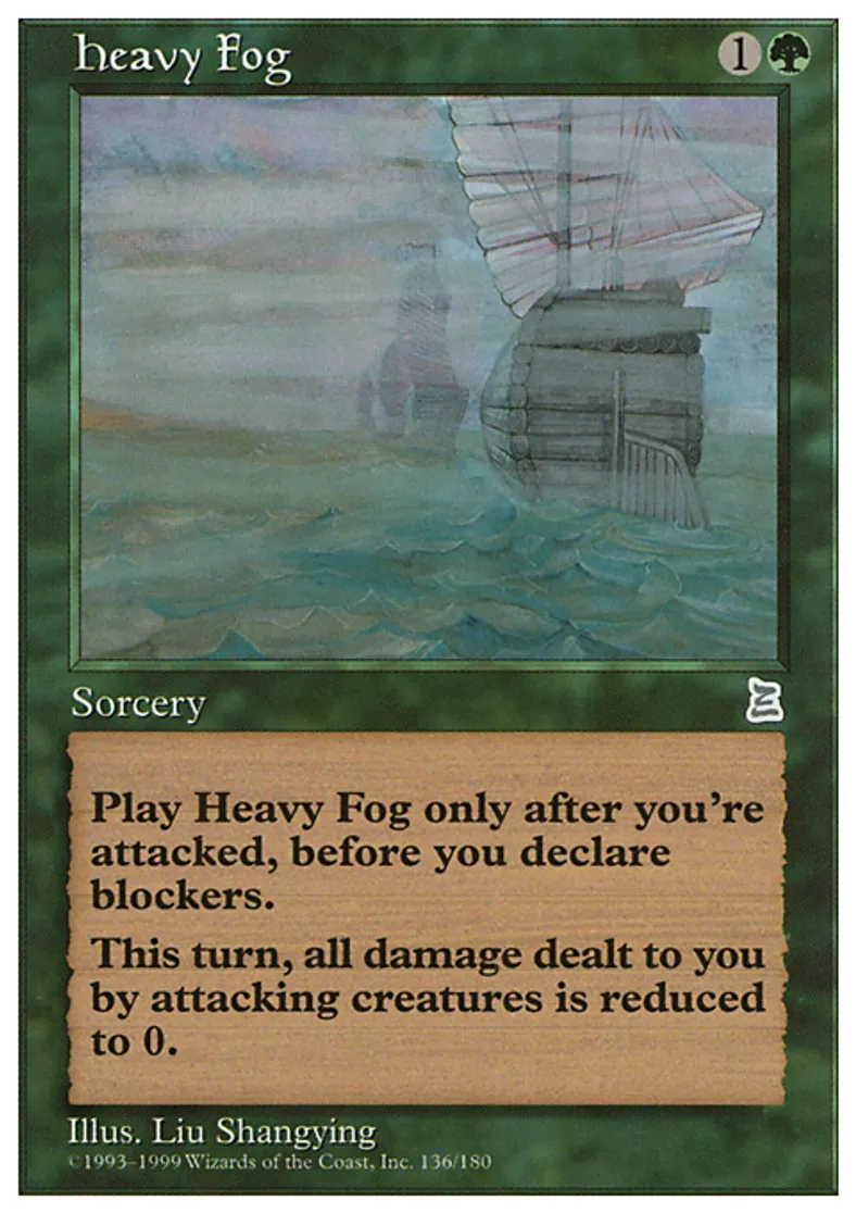 | Oracle Text | Cast Heavy Fog only during the declare attackers step and only if you've been attacked this step. Prevent all damage that would be dealt to you this turn by attacking creatures. | ||