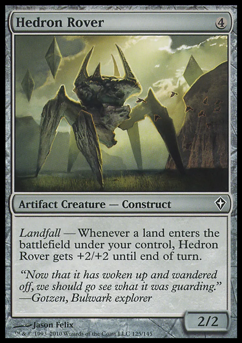 | Oracle Text | Landfall — Whenever a land enters the battlefield under your control, Hedron Rover gets +2/+2 until end of turn. | ||