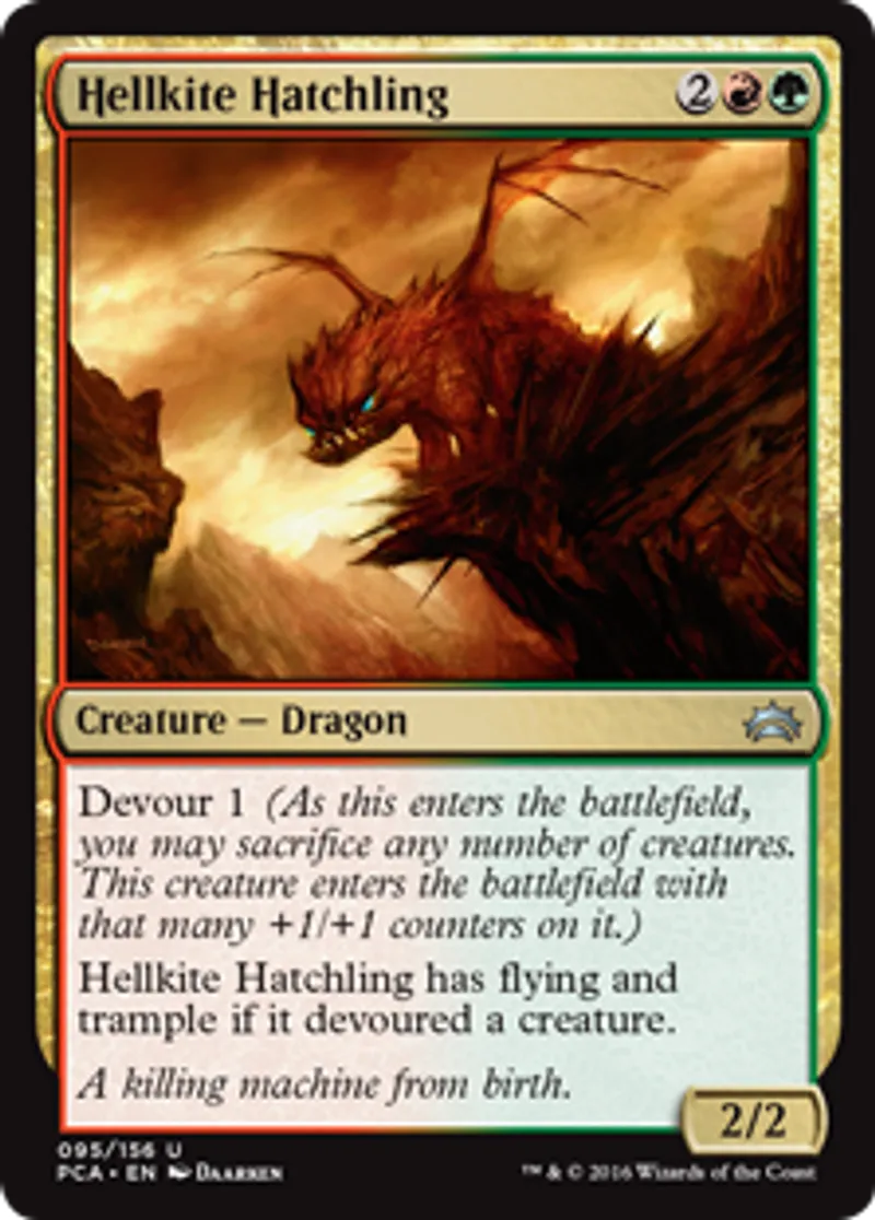 | Oracle Text | Devour 1 (As this enters the battlefield, you may sacrifice any number of creatures. This creature enters the battlefield with that many +1/+1 counters on it.) Hellkite Hatchling has flying and trample if it devoured a creature. | ||