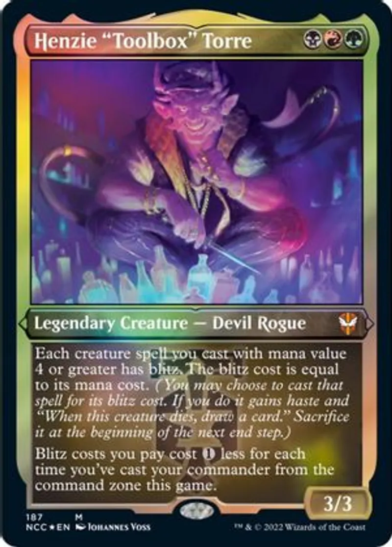 Magic: the Gathering (mtg) Mythic Rare Legendary Creature — Devil Rogue Henzie "Toolbox" Torre from New Capenna Commander (NCC) last updated 2026-02-21 16:06:02