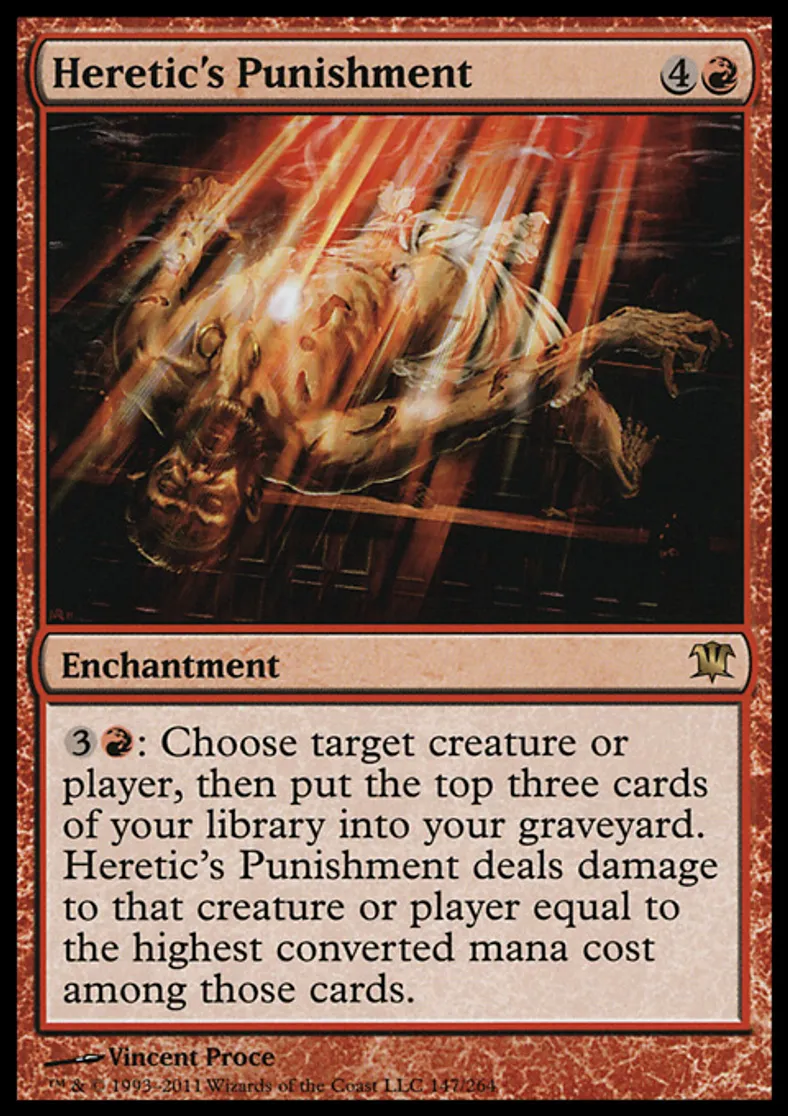 | Oracle Text | {{3}}{{r}}: Choose target creature or player, then put the top three cards of your library into your graveyard. Heretic's Punishment deals damage to that creature or player equal to the highest converted mana cost among those cards. | ||