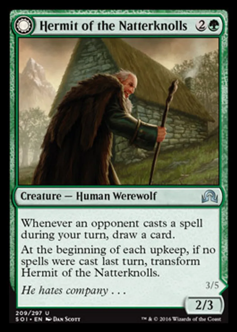 | Oracle Text | Whenever an opponent casts a spell during your turn, draw a card. At the beginning of each upkeep, if no spells were cast last turn, transform Hermit of the Natterknolls. | ||