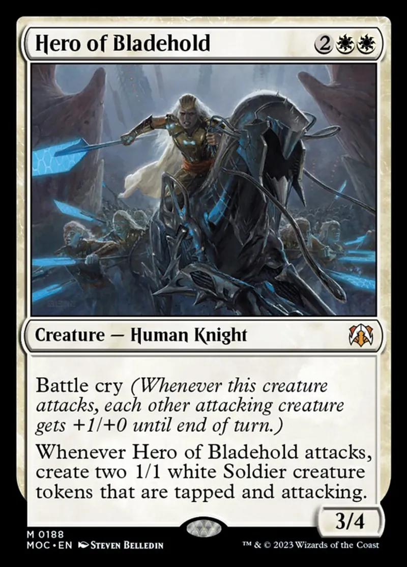 Hero of Bladehold is a mythic in the set March of the Machine Commander.