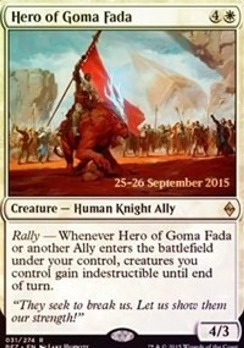 | Oracle Text | Rally -- Whenever Hero of Goma Fada or another Ally enters the battlefield under your control, creatures you control gain indestructible until end of turn. | ||