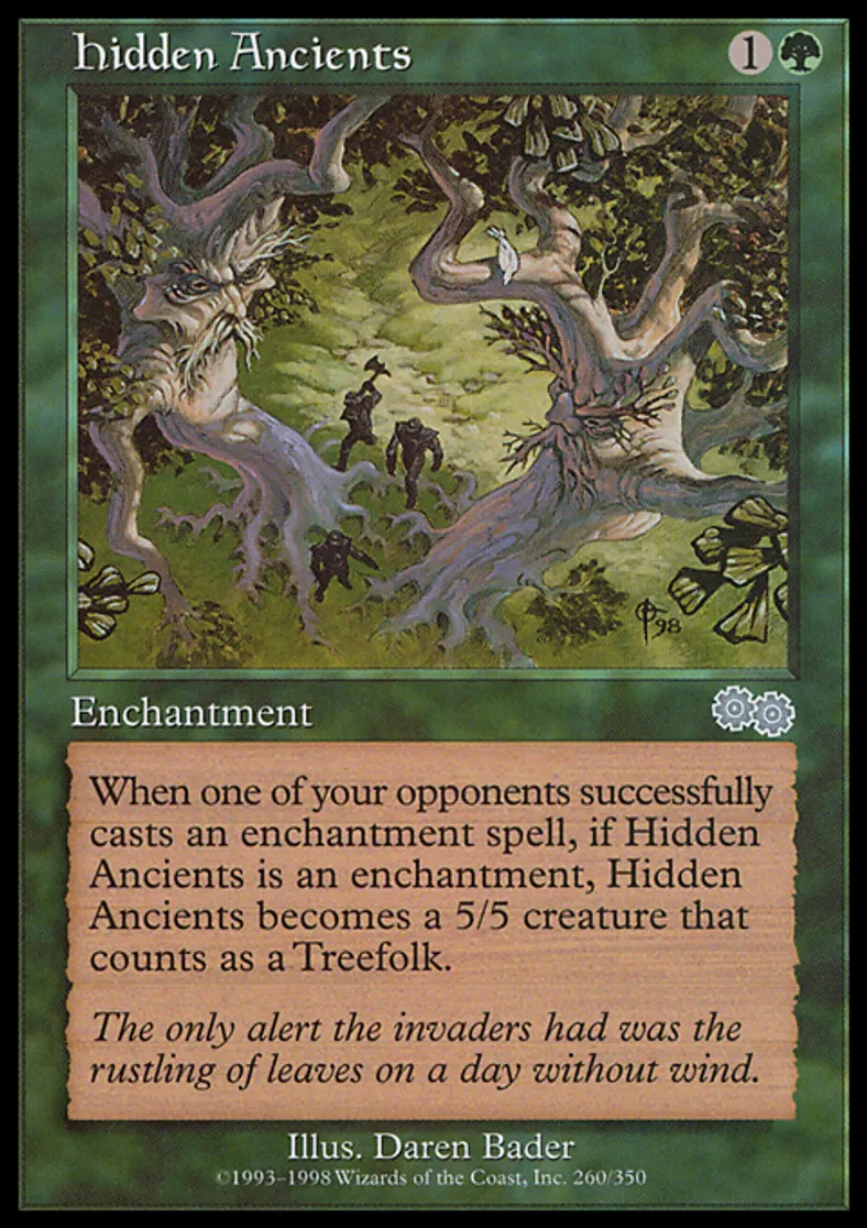 | Oracle Text | When an opponent casts an enchantment spell, if Hidden Ancients is an enchantment, Hidden Ancients becomes a 5/5 Treefolk creature. | ||