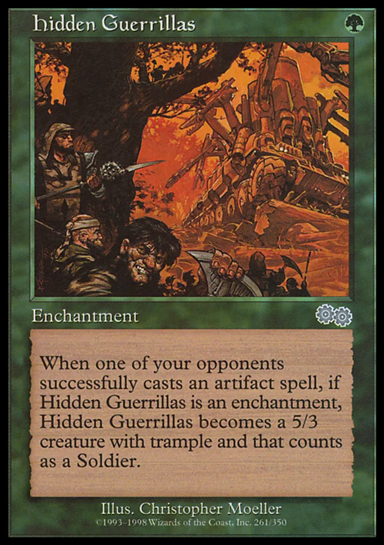 | Oracle Text | When an opponent casts an artifact spell, if Hidden Guerrillas is an enchantment, Hidden Guerrillas becomes a 5/3 Soldier creature with trample. | ||