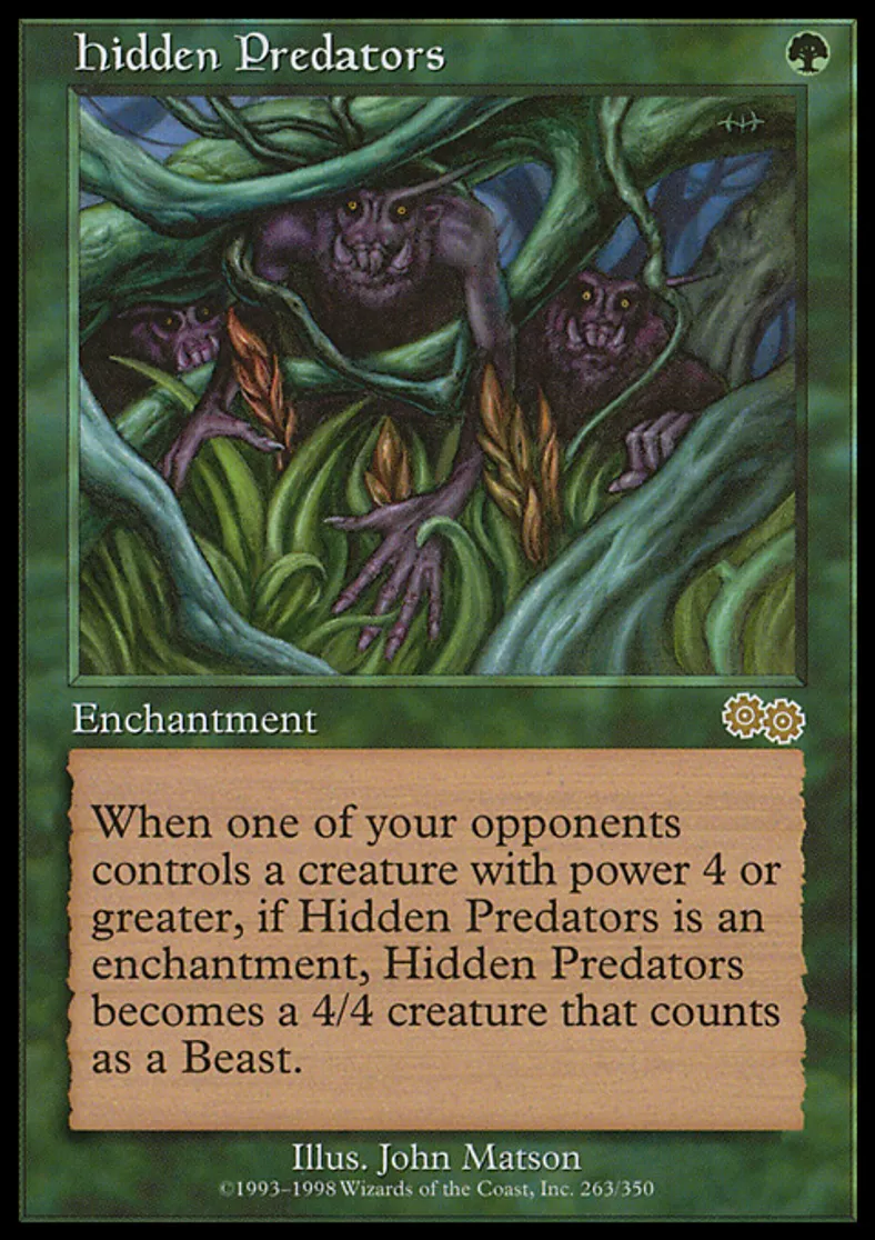 | Oracle Text | When an opponent controls a creature with power 4 or greater, if Hidden Predators is an enchantment, Hidden Predators becomes a 4/4 Beast creature. | ||