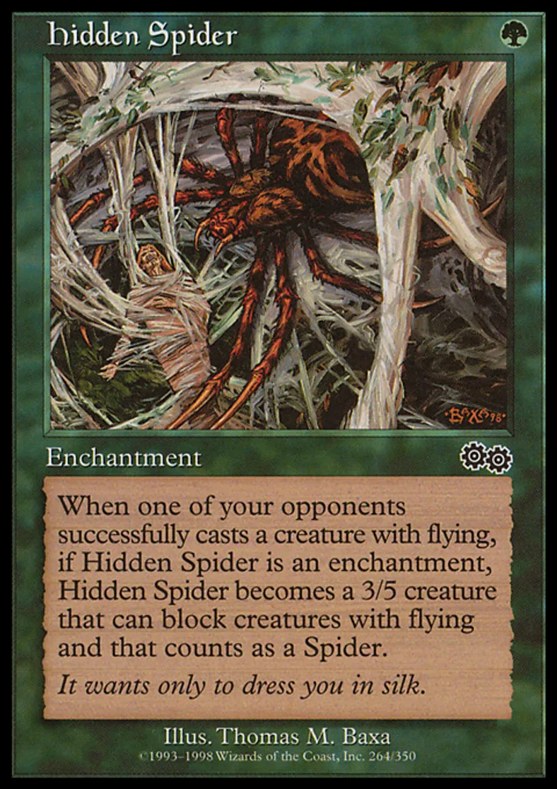 | Oracle Text | When an opponent casts a creature spell with flying, if Hidden Spider is an enchantment, Hidden Spider becomes a 3/5 Spider creature with reach. (It can block creatures with flying.) | ||