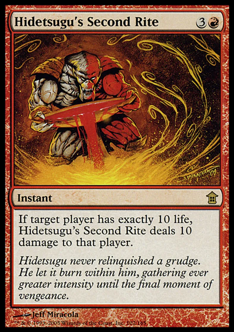 | Oracle Text | If target player has exactly 10 life, Hidetsugu's Second Rite deals 10 damage to that player. | ||