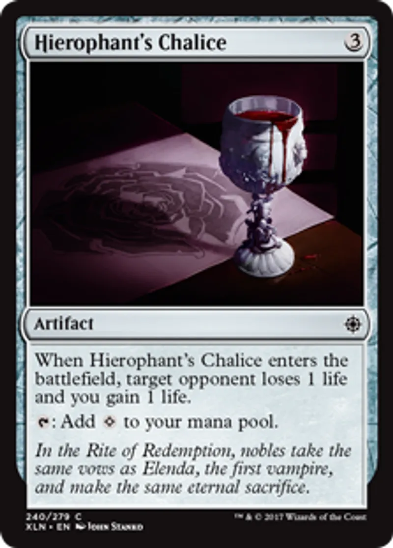 | Oracle Text | When Hierophant's Chalice enters the battlefield, target opponent loses 1 life and you gain 1 life. {{t}}: Add {{Colorless}} to your mana pool. | ||
