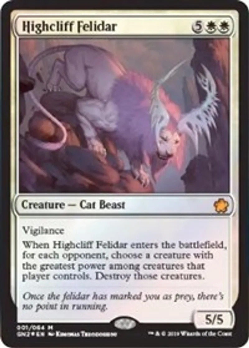 | Oracle Text | Vigilance\r\nWhen Highcliff Felidar enters the battlefield, for each opponent, choose a creature with the greatest power among creatures that player controls. Destroy those creatures. | ||