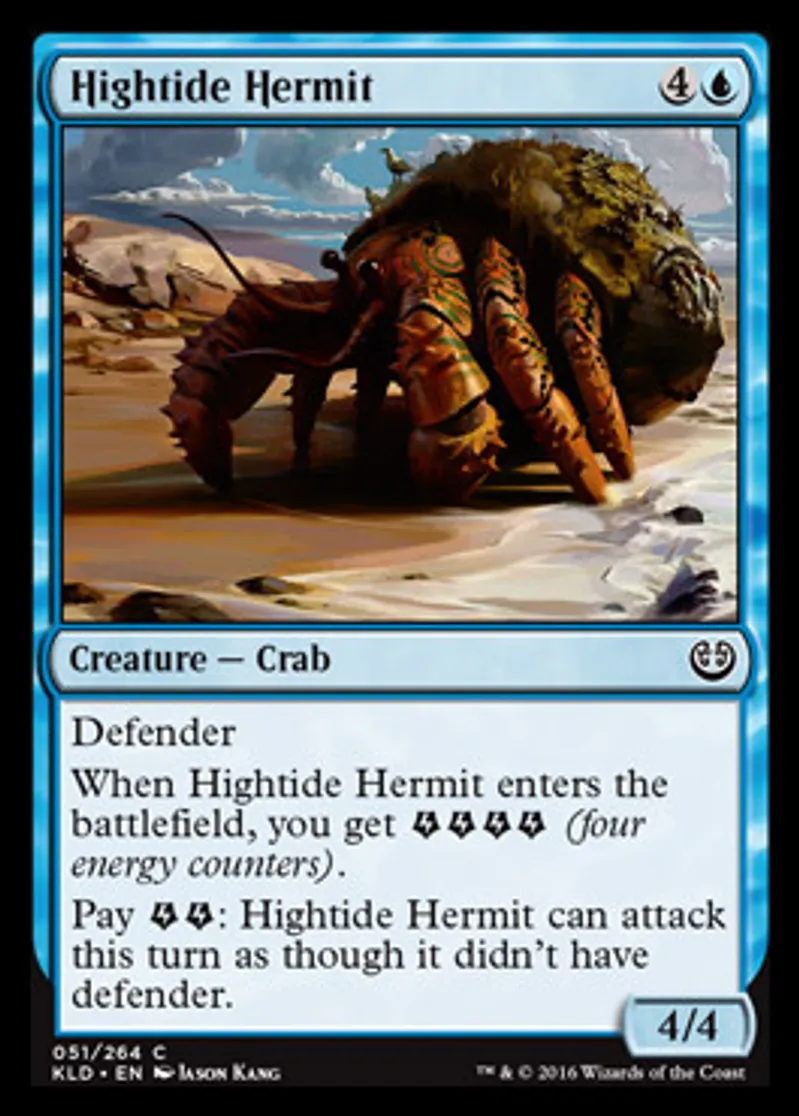 | Oracle Text | Defender When Hightide Hermit enters the battlefield, you get {{Energy}}{{Energy}}{{Energy}}{{Energy}} (four energy counters). Pay {{Energy}}{{Energy}}: Hightide Hermit can attack this turn as though it didn't have defender. | ||