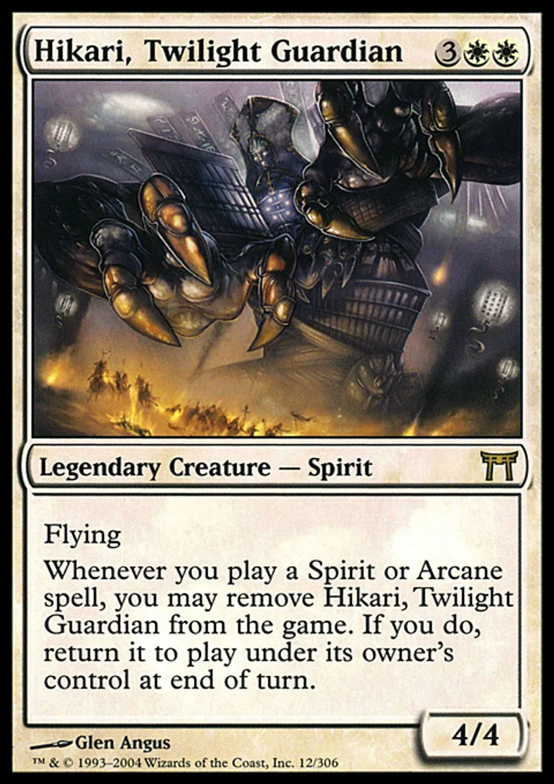 | Oracle Text | Flying Whenever you cast a Spirit or Arcane spell, you may exile Hikari, Twilight Guardian. If you do, return it to the battlefield under its owner's control at the beginning of the next end step. | ||