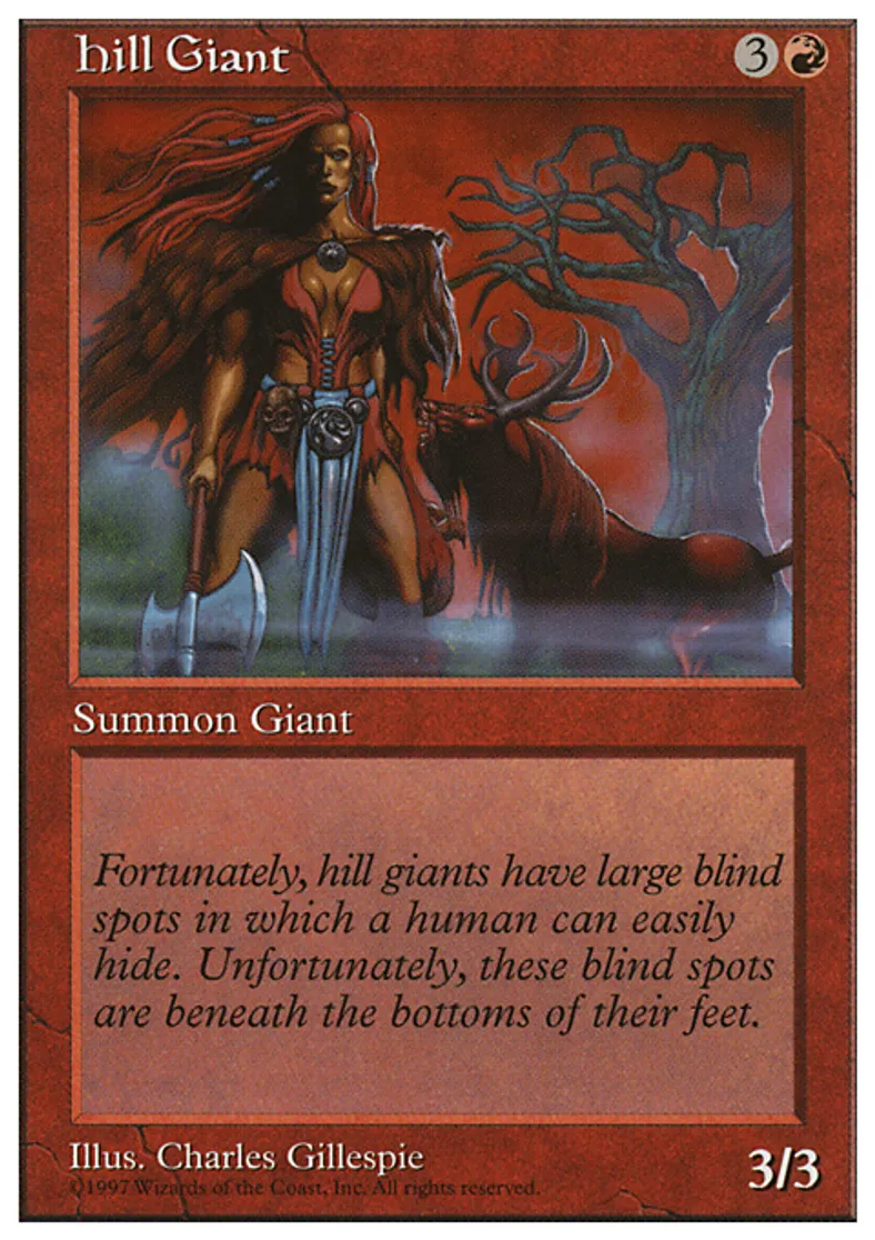 | Flavor Text | Fortunately, hill giants have large blind spots in which a human can easily hide. Unfortunately, these blind spots are beneath the bottoms of their feet. | ||